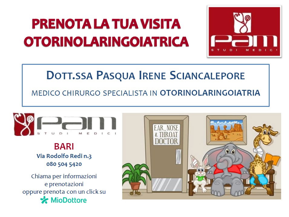 Book your otolaryngology visit with Dr. Pasqua Irene Sciancalepore in BARI at PAM Studi Medici in Via Rodolfo Redi n.3. Call for information and reservations 0805045420 or save time and book online!
